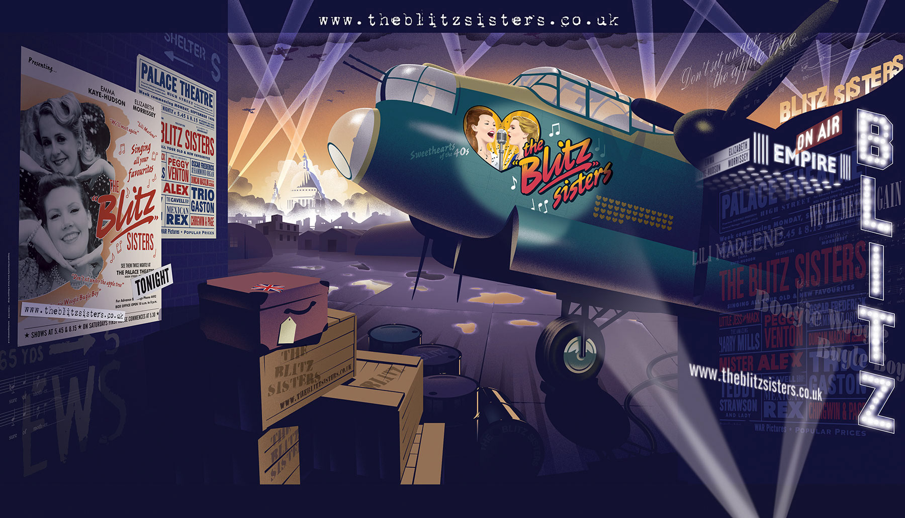 A large format illustration as a backdrop for a WWII-inspired singing duo.