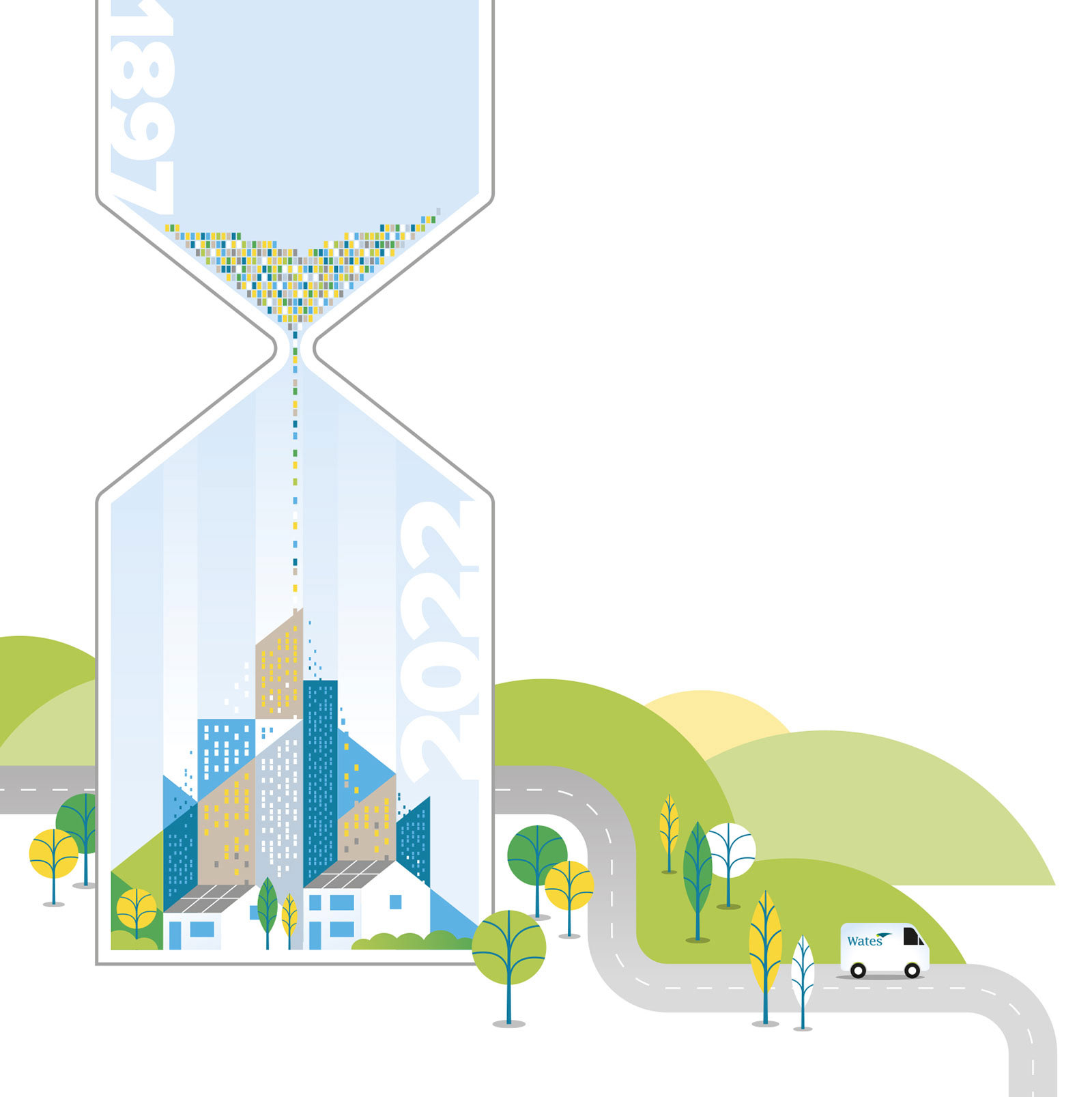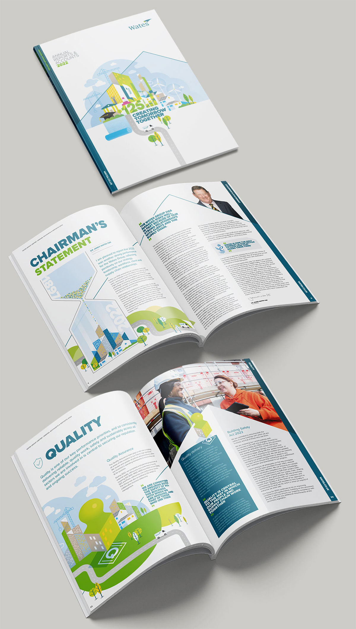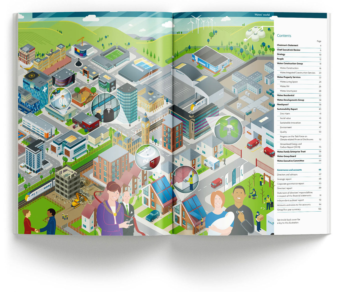 Illustrations for the Wates Group Annual Report and Accounts in 2021 and 2022.